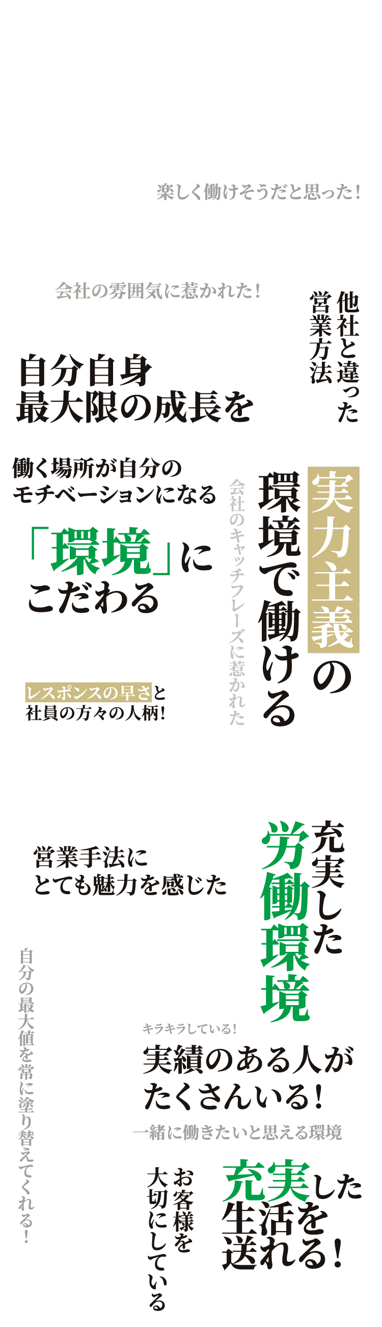 「最短で最高の自分になれ」というキャッチコピーに惹かれました。自分自身の頑張り次第で評価される環境が整っていて、若い時からバリバリ活躍したいと思い、入社を決めました。