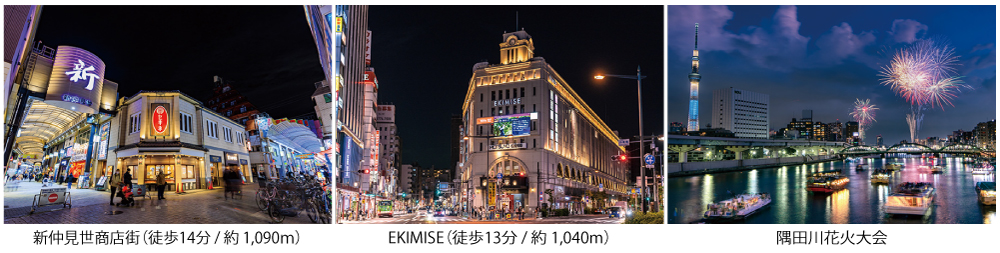 5つのエリアに分かれた浅草最大のアーケード商店街である「新仲見世商店街」を日常の一部とし、無印良品やダイソーなど人気店が集結する「浅草ROX」や、仲見世と駅が融合した複合商業施設「EKIMISE」など、生活を快適に支える商業施設も充実しています。