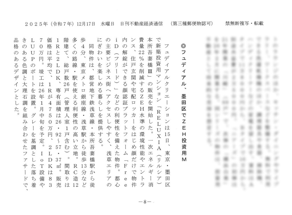 日刊不動産経済通信に当社記事が掲載されました 2025年12月17日 メディア この度、2025年12月17日付 「日刊不動産経済通信」(株式会社不動産経研究所発行)に、当社記事が掲載されました。詳細は、以下ご覧ください。
