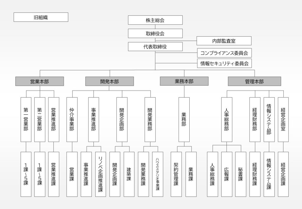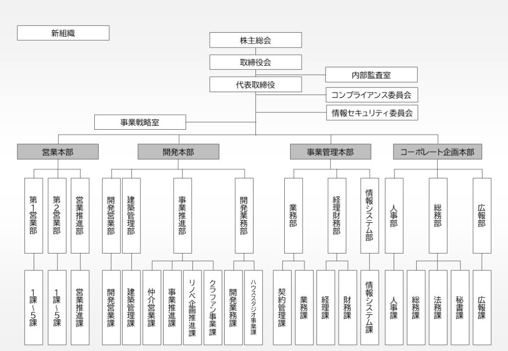 ①開発本部管轄を4部体制(開発営業部、建築管理部、事業推進部、開発業務部)へ再編。