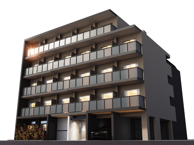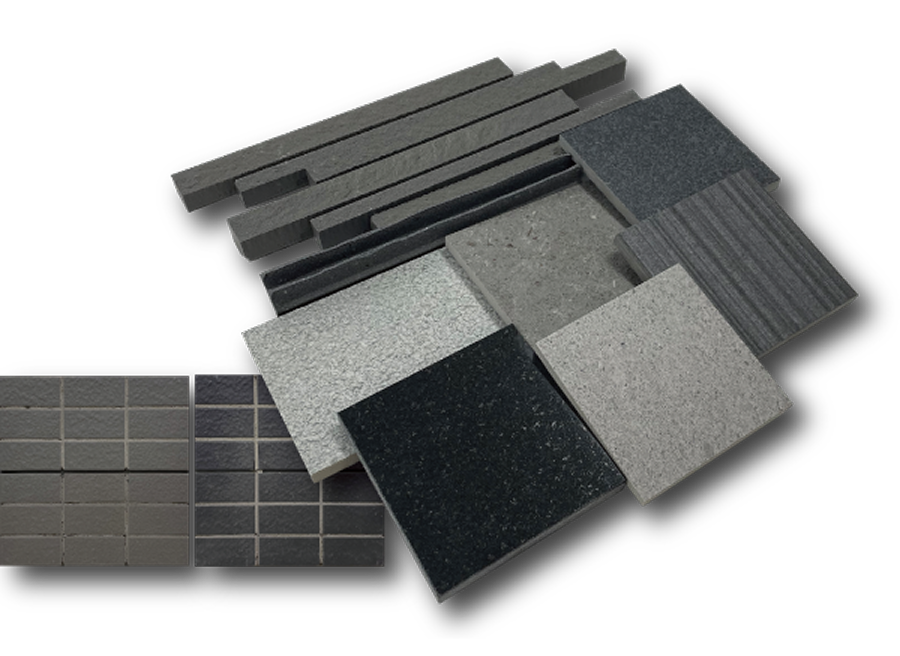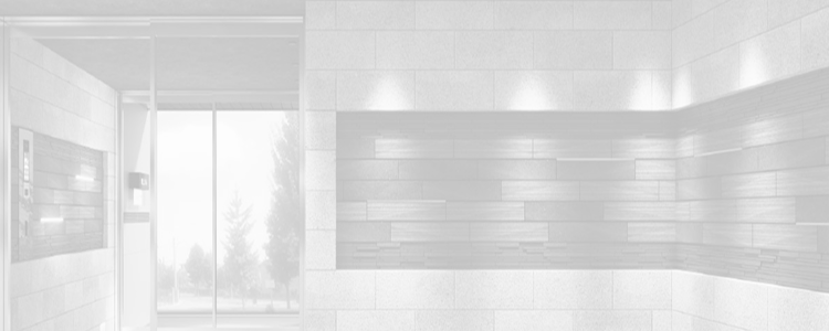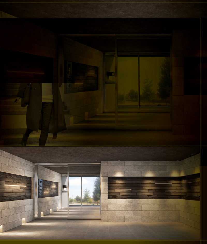 表情の異なる石目調タイルが美しいコントラストを描くエントランスから、