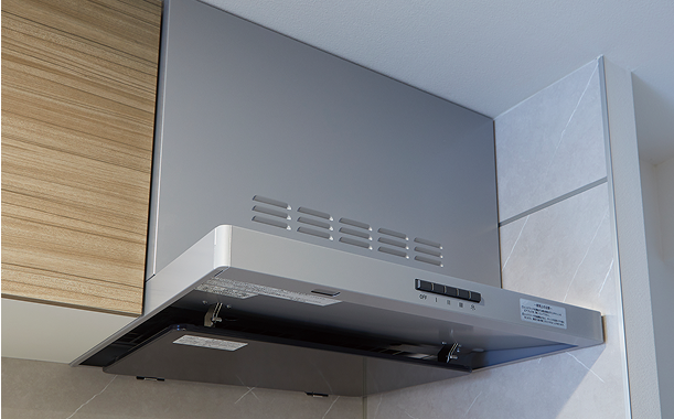 コンロ上部に設置したレンジフードは油汚れをはじくフィルター付なので、お手入れが簡単です。