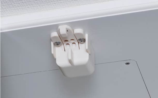 地震などの揺れによる棚からの滑り落ちを防ぐ、耐震ラッチを設置しています。