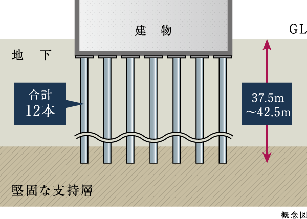 地表面から約35.0m下にある砂礫層の地盤に、杭径1,200φ〜2,000φの場所打ちコンクリート杭を37.5m〜42.5mの深さまで12本打込み、建物をしっかりと支えています。