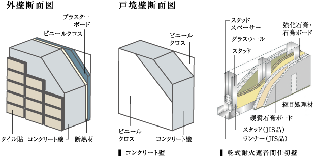外壁・戸境は、外部や隣戸からの生活音を遮る厚みでプライバシーにも配慮しており、より過ごしやすい住空間を創り出します。 ※外壁320〜340㎜、戸境壁及び乾式耐火間仕切壁136㎜