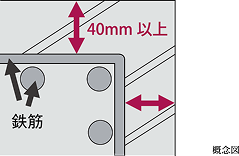 かぶり厚とは鉄筋を覆っているコンクリートの厚さのことです。建築基準法で定められた数値をしっかりとクリアすることで、コンクリートのアルカリ性によって鉄筋が錆びるのを防いでいます。