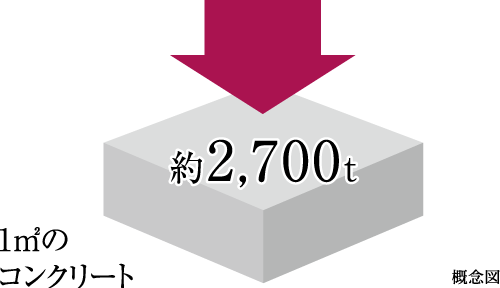 設計基準圧縮強度27N/m㎡以上の高い強度を持つコンクリートを使用しています。コンクリートの強度を表す指標、水とセメントとの割合を示す水セメント比も55%以下です。