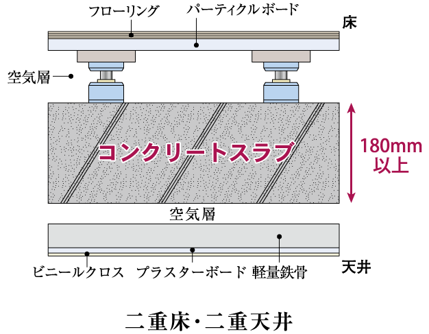 上下階への音漏れの抑制、また配線のメンテナンスや将来のリフォームにも有効な二重床・二重天井構造を採用しています。