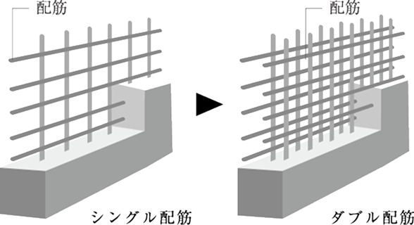 主要な壁や床の鉄筋には、コンクリート中の鉄筋が二重のダブル配筋を採用し、耐久性を確保しました。