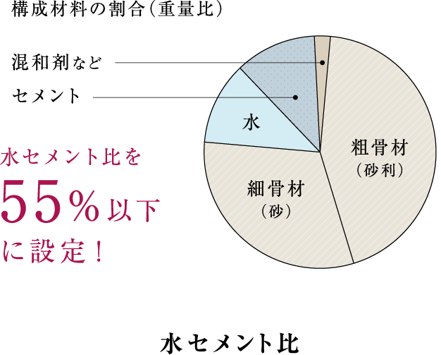 水の比率を低く抑えることでコンクリートの収縮を低く抑え、ひび割れも起こりにくい耐久性の高い建物を実現しています。