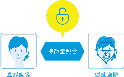 顔画像データから、人物の特徴(目・鼻・口の位置関係等)を抽出後、それを数値化したデータを保持しておき、解錠時に特徴量を比較検証します。