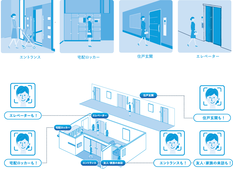 エントランスや宅配ロッカー、玄関の鍵、エレベーターを顔パスで快適にスマートに。