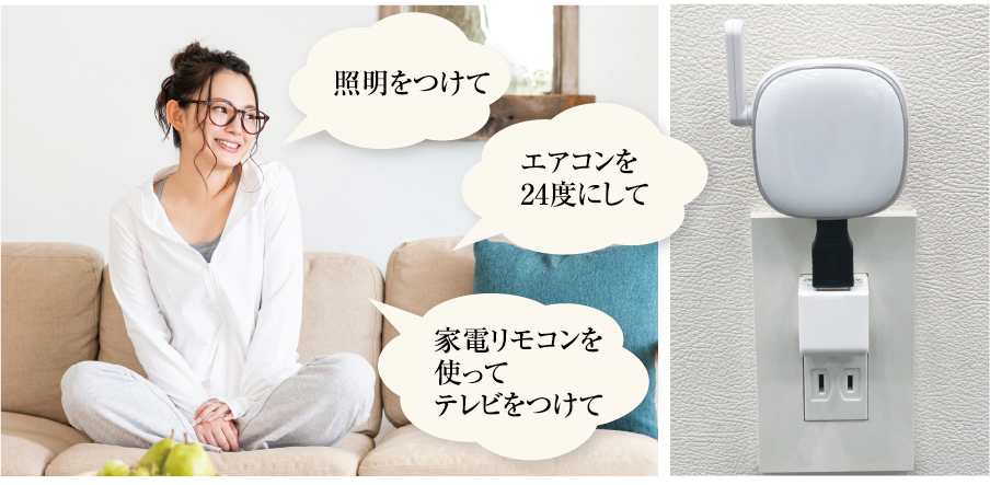 外出先からスマホで家電を操作。本体に搭載している温度・湿度・照明センサーで状況を確認し、帰宅前の部屋や、留守番中のペットのいる空間を快適に保ち続けることができるので便利です。