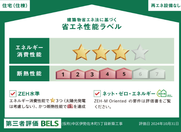 BELSとは建築物省エネ法の省エネ性能表示の努力義務に対応した住宅・建築物を格付けする唯一の第三者認証制度です。国土交通省では、建築物のエネルギー消費性能の見える化を通じて、性能の優れた建築物が市場で適切に評価され、選ばれるような環境整備等を図れるよう「建築物のエネルギー消費性能の表示に関する指針」を告示として制定しました。※本表示は「住棟全体」の評価であり「各住戸」の性能を担保するものではありません。