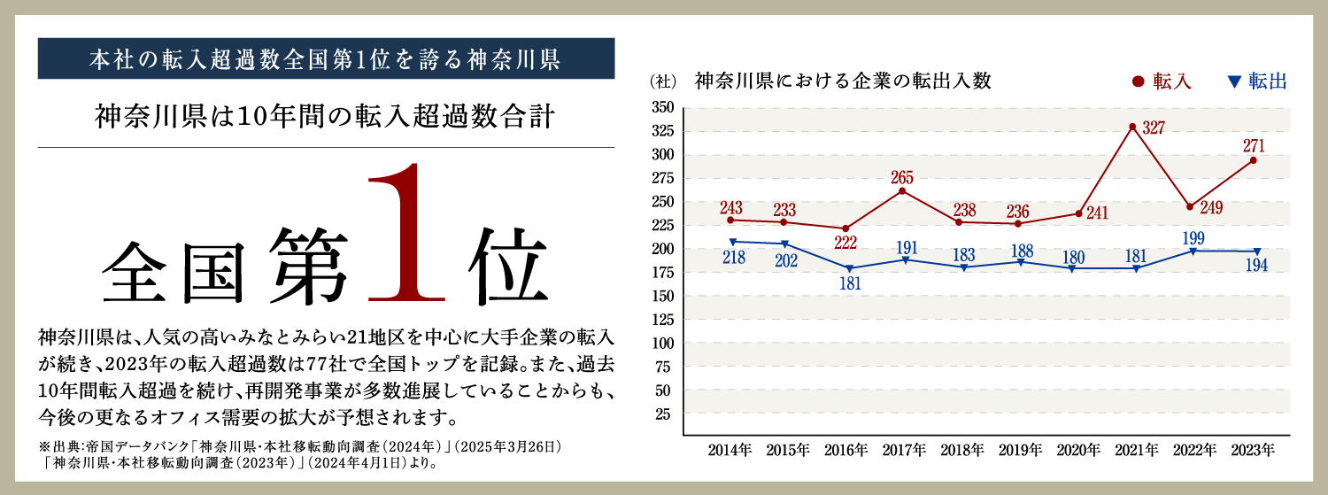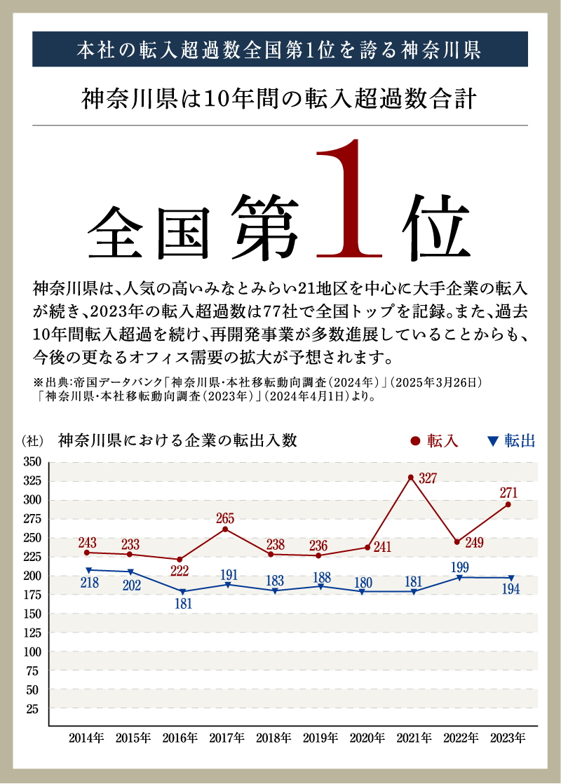 その発展に伴い、過去10年間の本社転入超過数全国トップを誇るこの地では数多くの企業が集い、オフィス需要も好調。