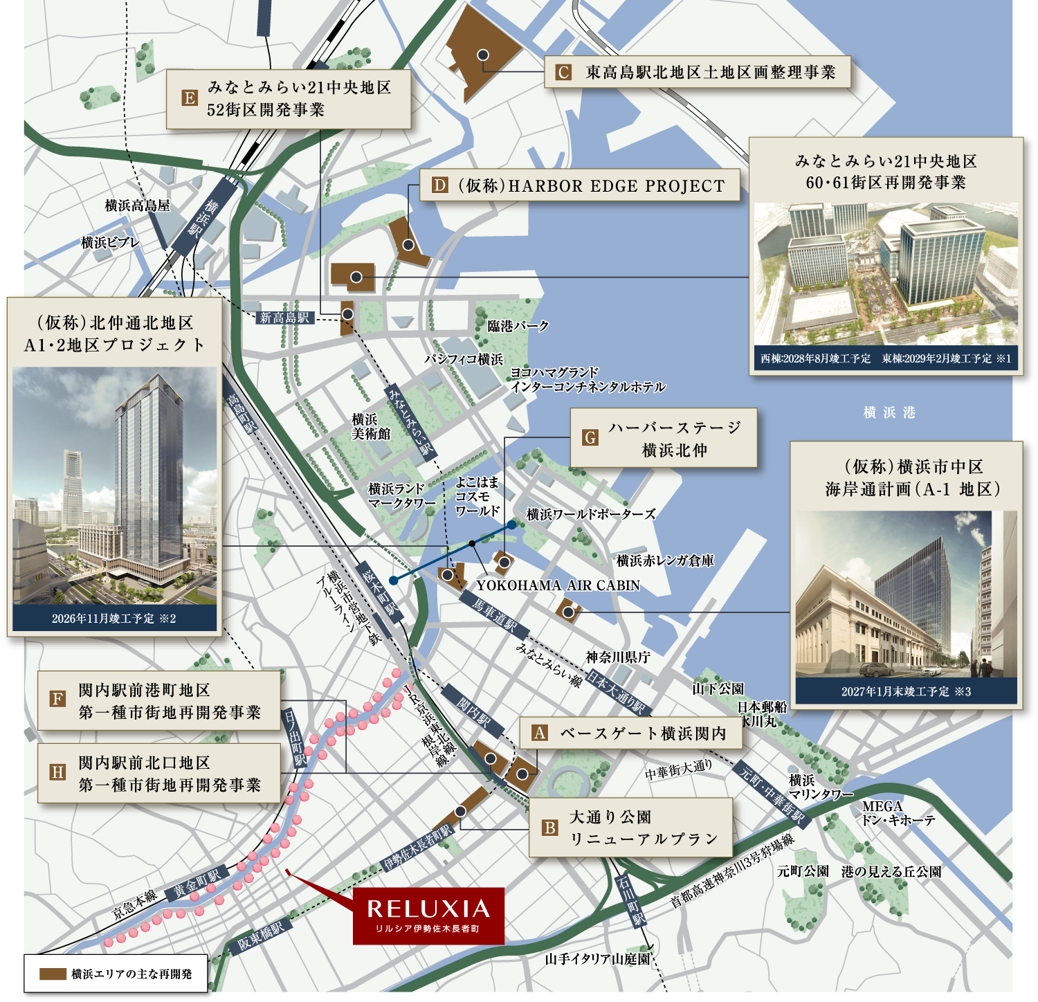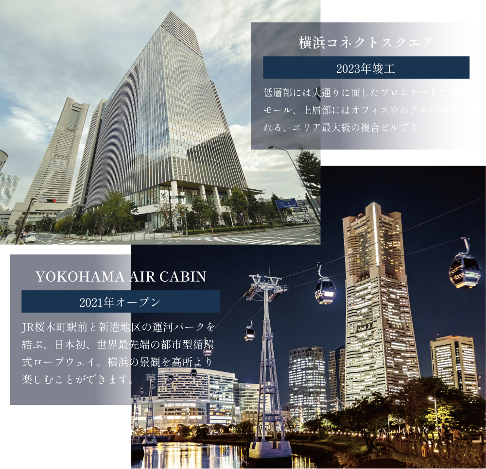 ※1出典:横浜市記者発表資料「みなとみらい21中央地区60・61街区の事業予定者を決定しました」(2024年2月5日)より。 ※2出典:住友不動産株式会社、株式会社大和地所ニュースリリース「(仮称)北仲通北地区A1・2地区プロジェクト」施設概要決定 横浜の歴史と未来をつなぐ北仲地区に「コンラッド横浜」 及び 「(仮称)ラ・トゥール横浜」 2027年開業」(2024年)4月10日)より。※3出典:三菱地所株式会社、ニュースリリース「(仮称)横浜市中区海岸通計画(A-1地区)」新築着工」(2024年5月10日)より。