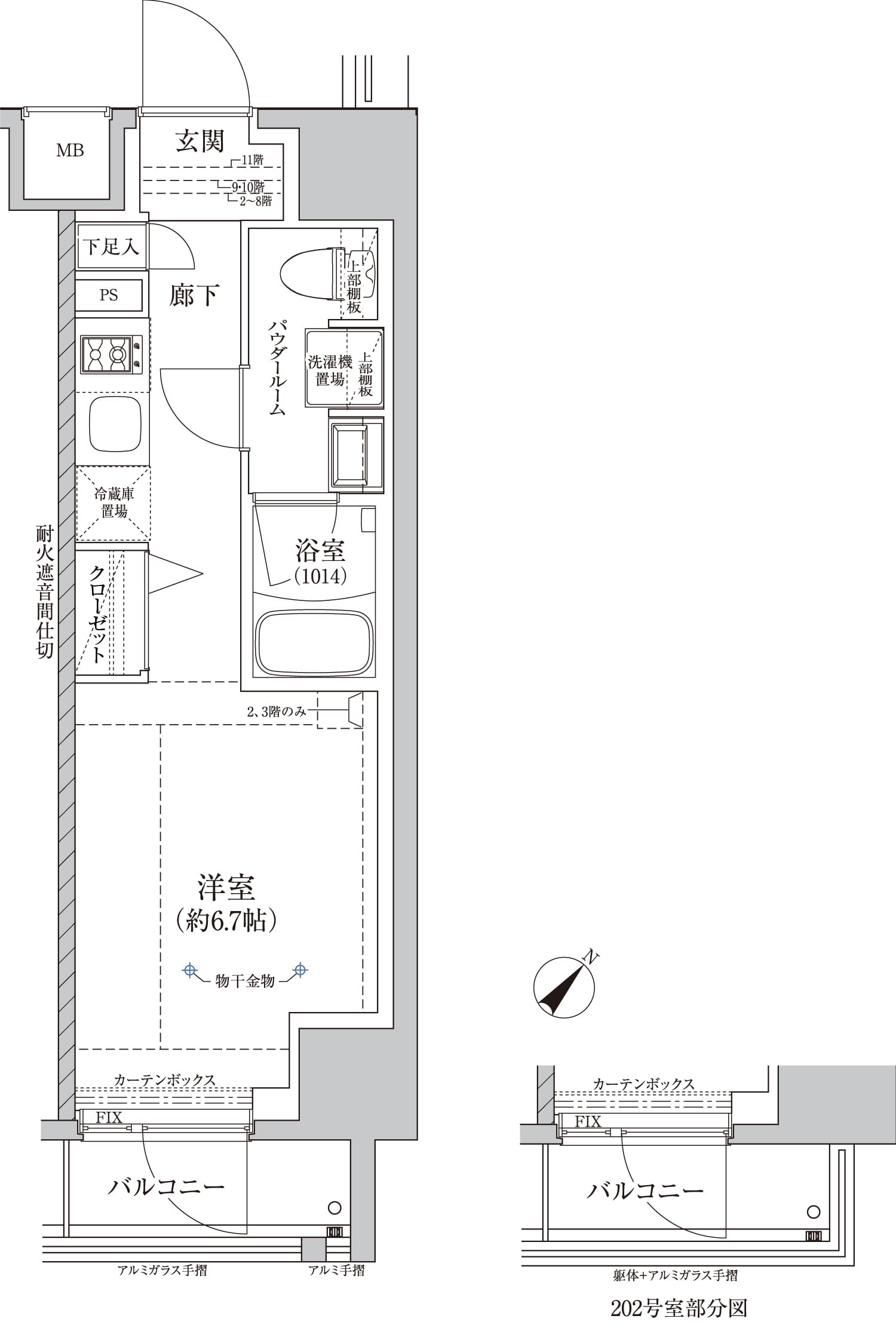 専有面積/22.77㎡(約6.88坪)※MB面積含む バルコニー面積/2.44㎡(約0.73坪)