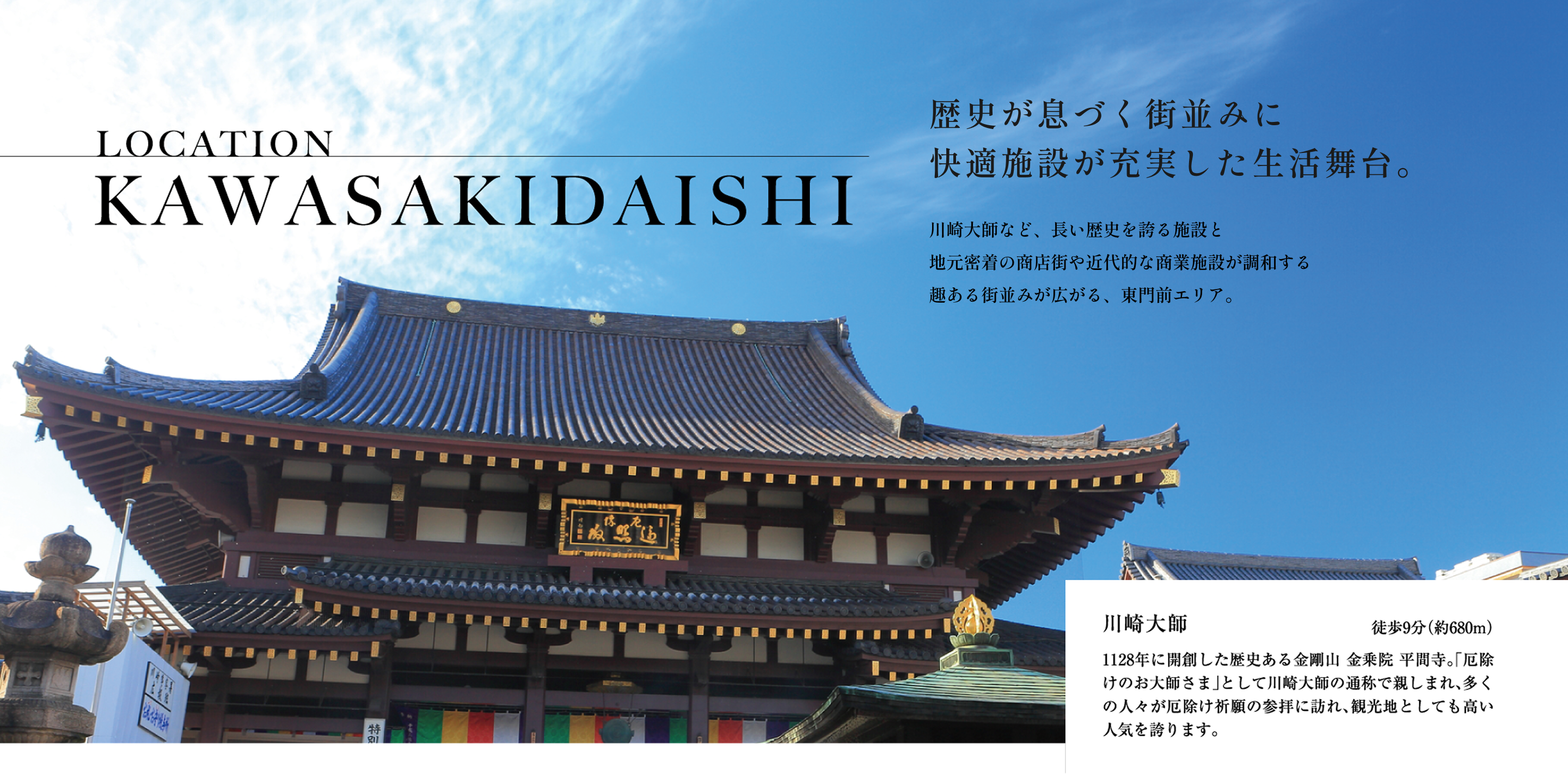「川崎大師」駅付近から表参道沿いに、いくつもの商店街が集まっており、日用品店や飲食店、クリニックなど、日々の生活を支えてくれるお店が揃っています。
